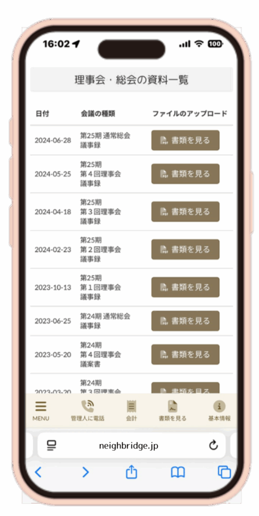 理事会の議事録、会計報告、修繕関連の見積書など、これまで紙で配布したりメールで添付していた資料を、すべてオンラインで共有できます。